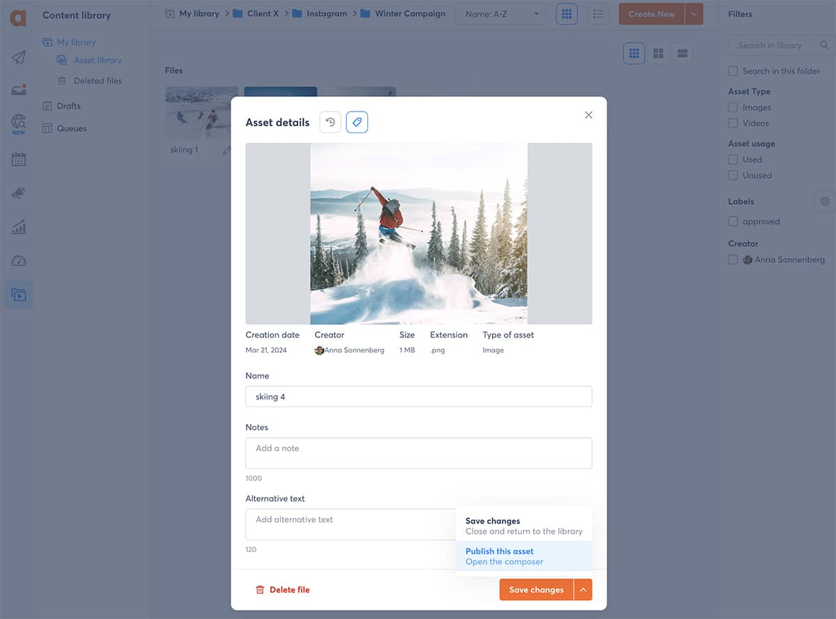 - Asset library (pictured below) where you can organize social media creatives by profile, campaign, theme, or any other category. Then, your team can easily add creatives from the asset library to social posts.