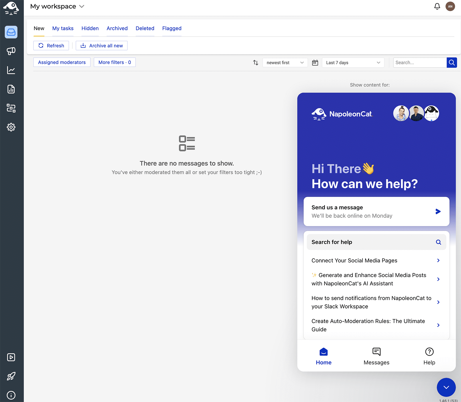 NapoleonCat offers chat and email support with all plans but doesn’t guarantee response times. The platform’s support page assures users that the support team usually replies in a few minutes.