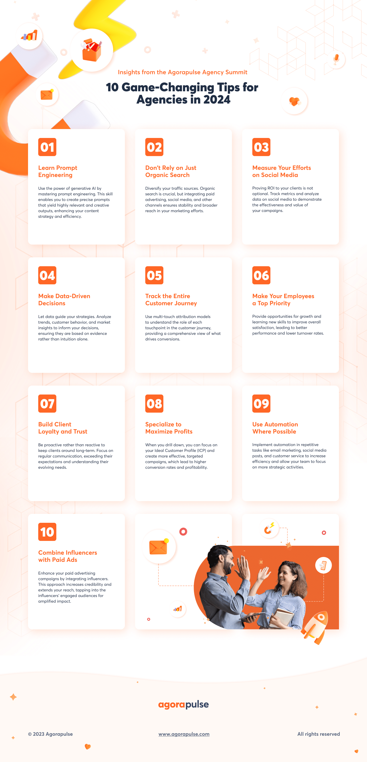 To help you through that maze, we created the “Must-Have Expert Insights for Agencies in 2024” ebook. It is a distillation of the top 10 insights learned from experts at the 2023 Agency Summit. These skilled professionals have found a way out of the maze and emerged with indispensable lessons that will help your agency continue to grow and scale successfully. Whether you need advice about harnessing the beast that is AI or understanding and proving social media ROI—consider this your guide to not just surviving but thriving in the agency world of tomorrow.