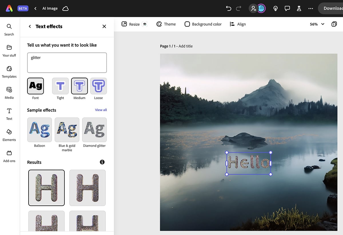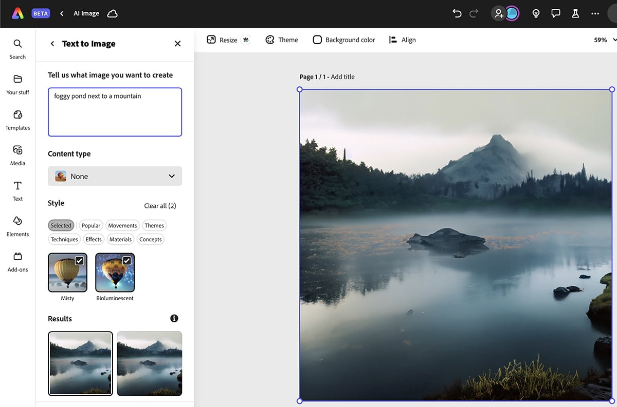 Adobe Express is another solid option for AI-generated content, especially if you want more style-related guidance. The platform has a text-to-image generator that offers pretty decent results. I used a super simple prompt for the image below and layered multiple styles to bring my idea to life.