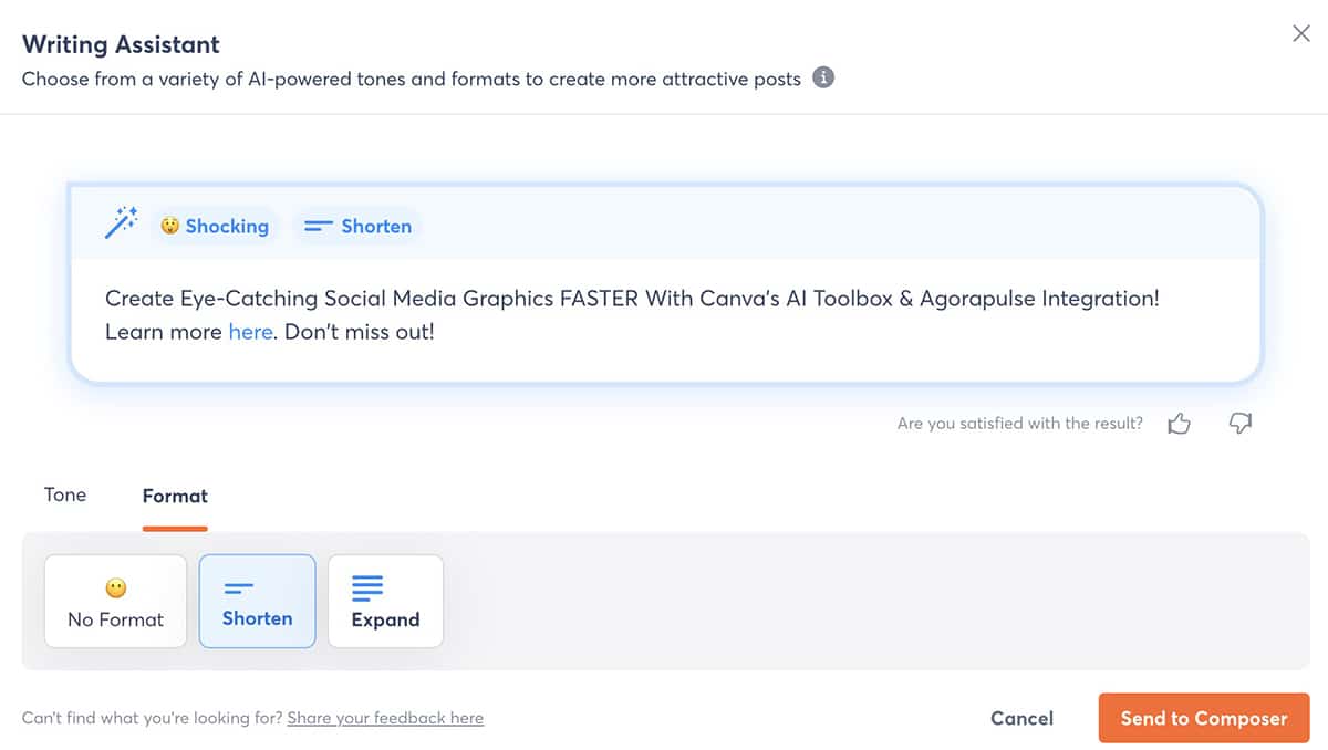 You can also click the Format button to shorten or expand the text. Even if you don’t use the AI writer to change the tone, this feature can improve your caption drafts. It’s great if you’ve already captured the right tone—but you need a little more or less.