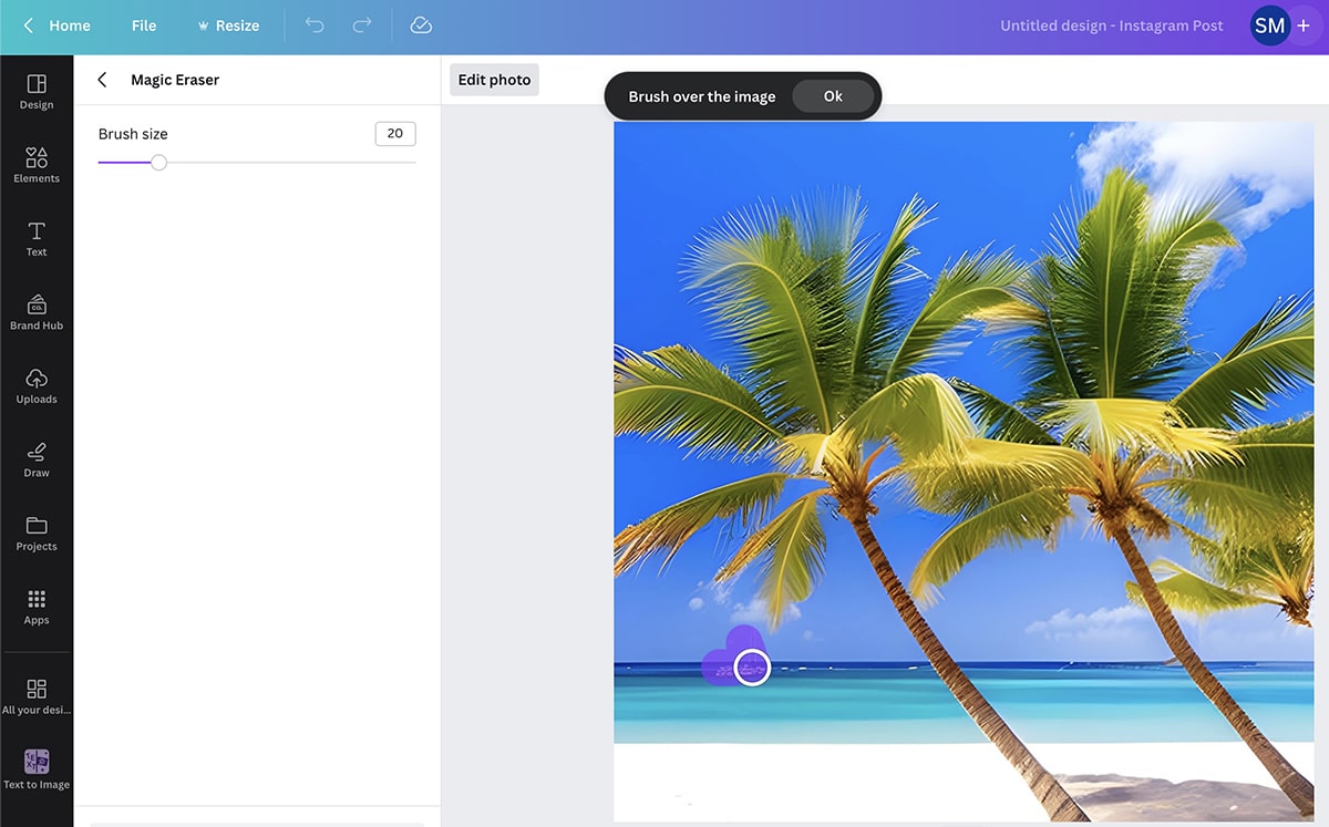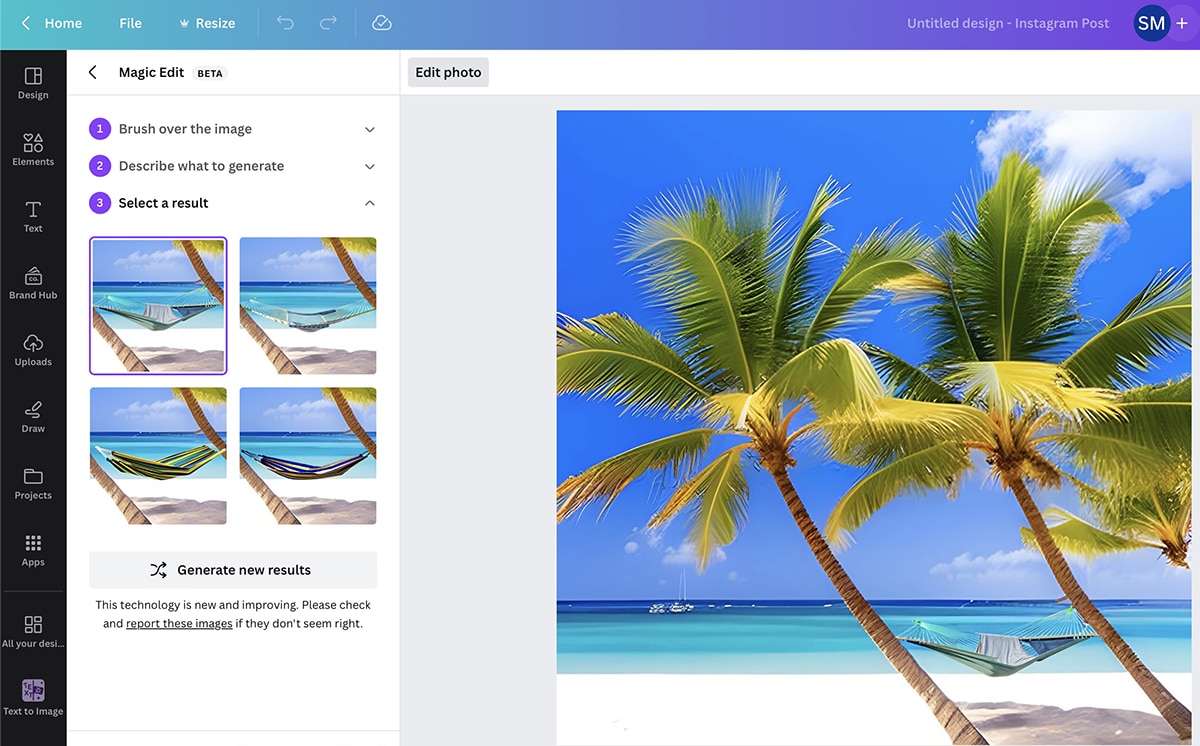I also like the Magic Edit tool for selectively adding AI-generated elements—like the beach hammock below. Since Canva integrates with Agorapulse, I also like that I can design creatives and optimize captions in one streamlined workflow.