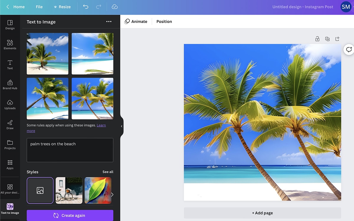 Canva’s text-to-image generator is great for creating graphics from scratch. Start by entering a prompt, the more detailed the better. You can edit and regenerate as many times as you like before publishing the image or adding it to a graphic.