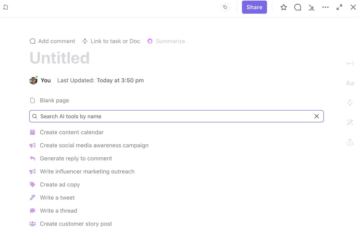 When you open ClickUp’s AI tools, you can search by industry to find relevant prompts. Then you can browse the prompt library (above, I selected social media marketing) and select a task you want the platform to complete for you.