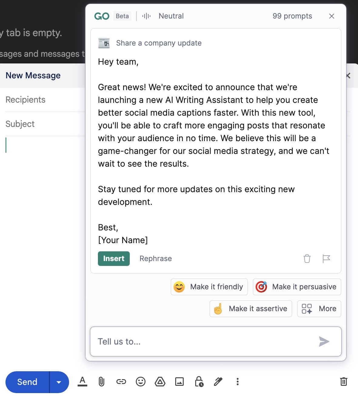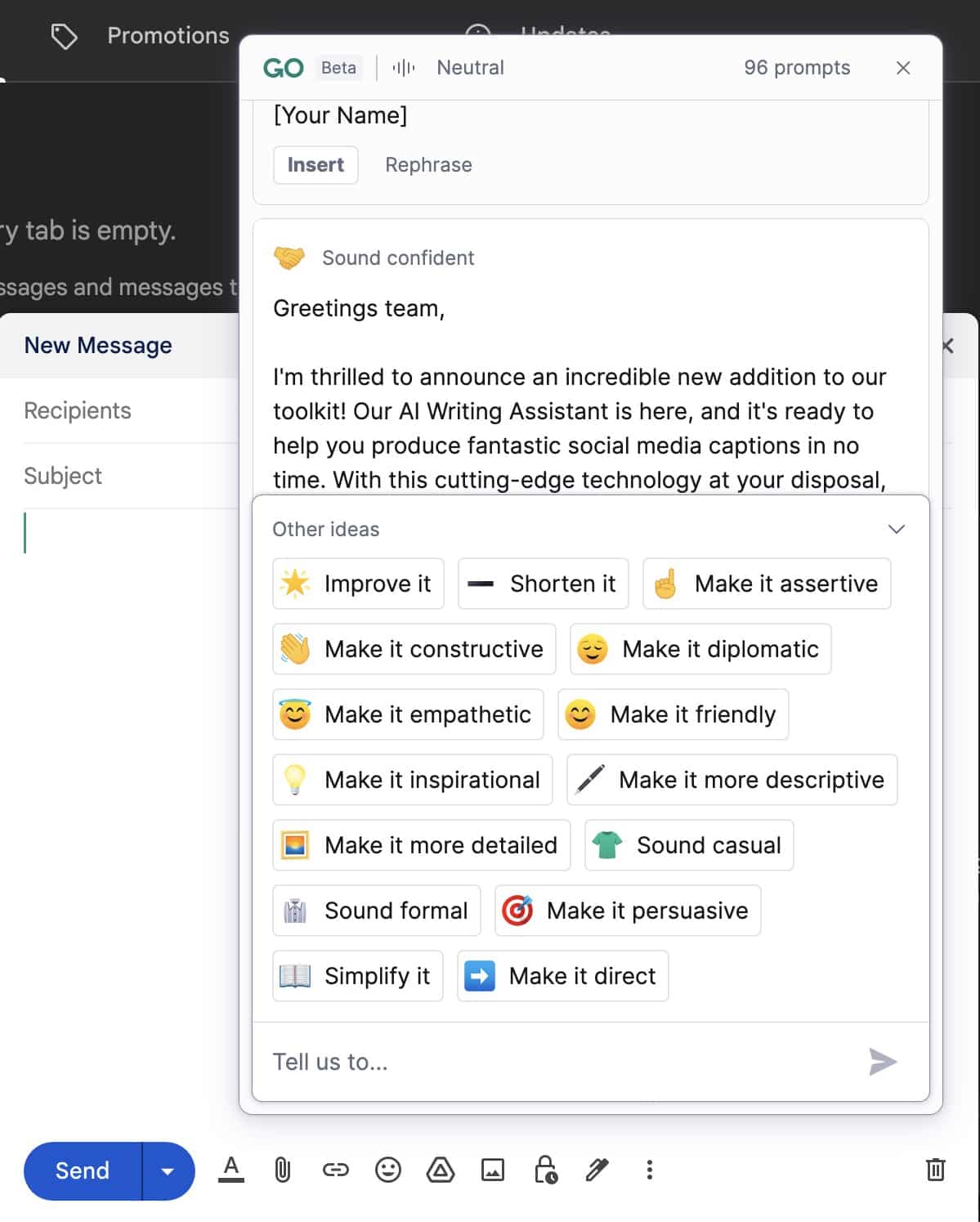 If the first version doesn’t sound quite right, you can use one of the tone suggestions (like “persuasive”) to fine-tune the email and get it closer to how you want it to sound. Then you can use the Grammarly plugin to review and perfect the email.