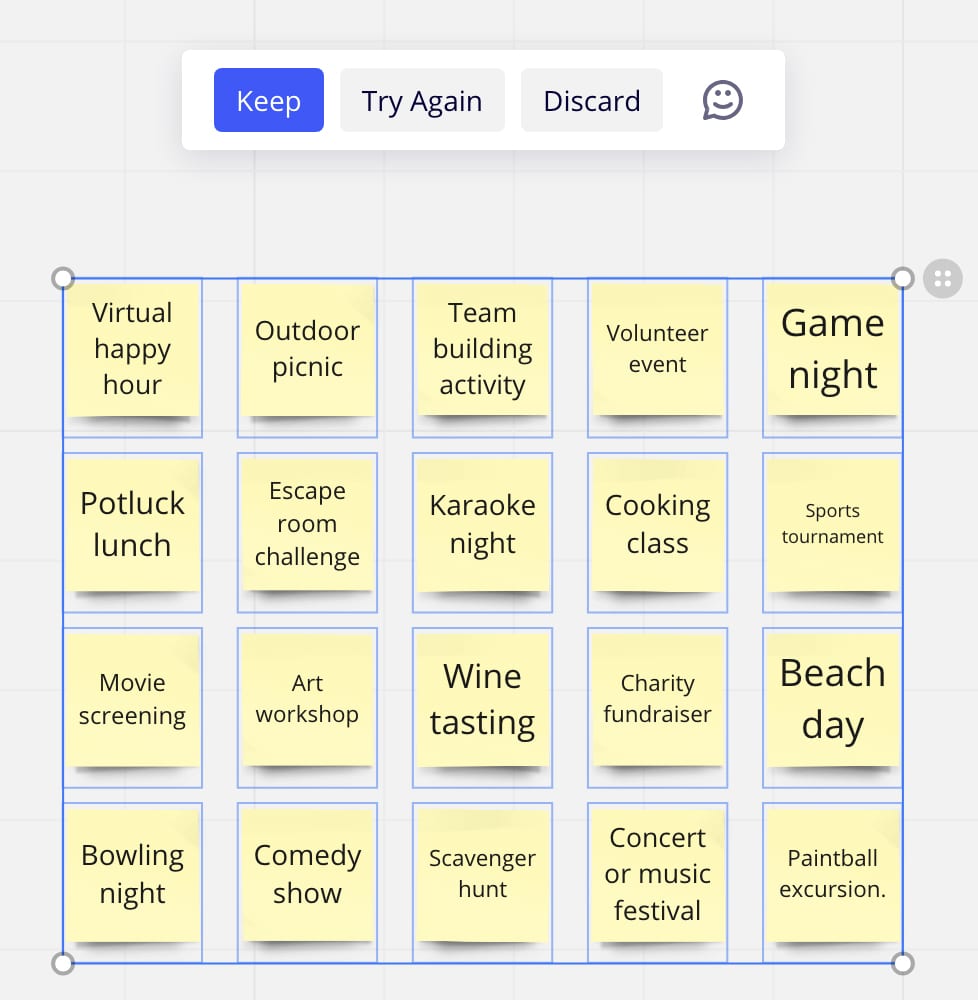 You can also prompt Miro AI to cluster ideas by sentiment so you can assess how your team is feeling. If you need more ideas, you can prompt Miro AI to do some of the brainstorming for you. The AI generator can create over a dozen more ideas from just one of yours, which can speed up your ideation.