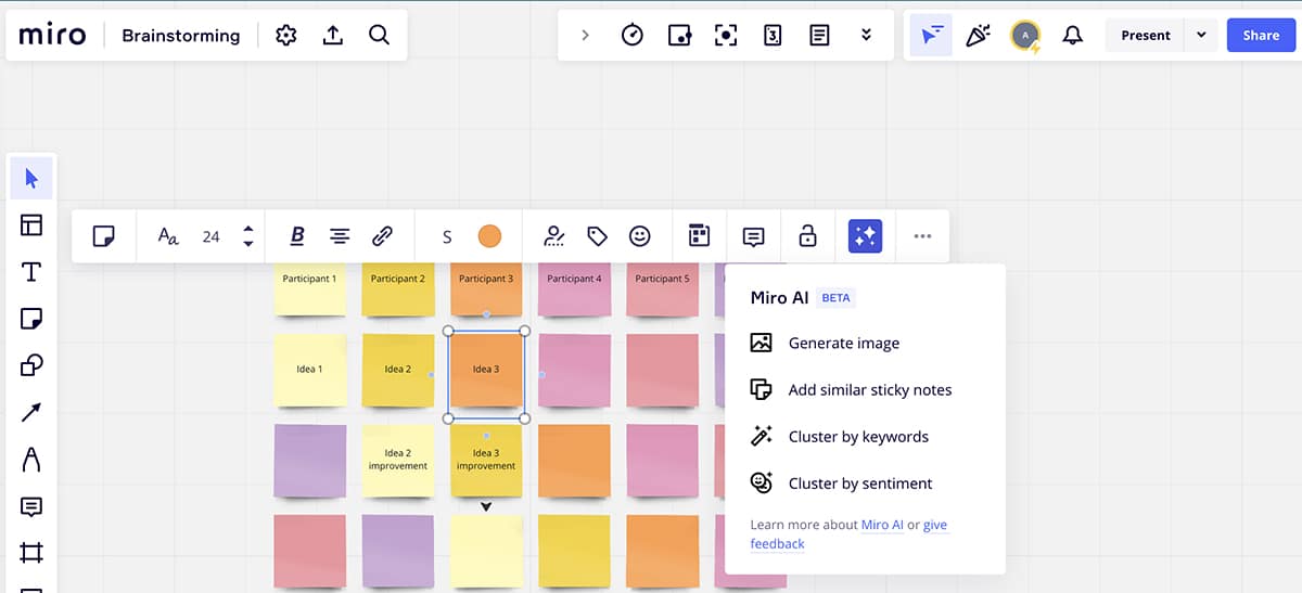 Miro’s templates are helpful for creating these visual workspaces quickly, and the platform’s new AI tools can help you process the results more efficiently. For example, after a brainstorming session, you can use Miro AI to cluster sticky notes by keywords so you can get a quick overview of topics.