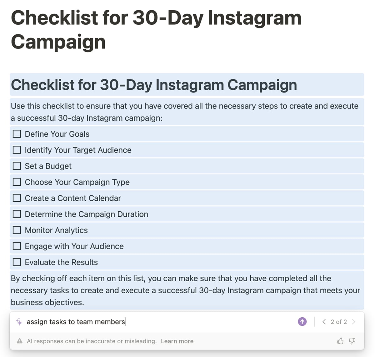 For example, you can turn notes or steps into a checklist that your team can work through. Then you can prompt Notion AI to assign tasks to team members or add due dates within a certain timeframe.