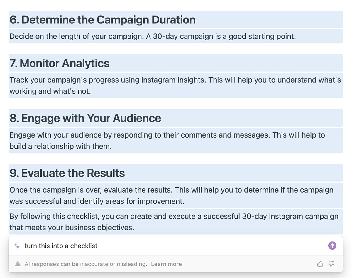 Although you can start with an existing document, you don’t necessarily need one. You can give Notion AI a prompt and use the output as the foundation for your plan or process.