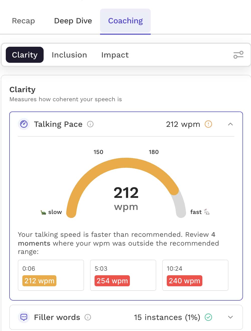 Read.ai also scores meetings, rating the engagement and overall sentiment. Want to get more out of meetings? The platform has a meeting coach that rates your speaking speed, how inclusive you were, and the overall impact you made during the meeting.
