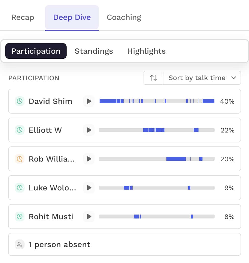 In addition to providing transcripts, Read.ai automatically highlights keywords and calculates how much each attendee spoke during the meeting. The platform also calls out highlights and makes it easy for you to click through and rewatch or relisten to them.