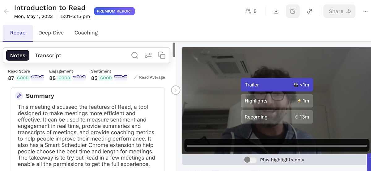 Read.ai can also listen in to your meetings and transcribe conversations. But this tool is a bit more advanced, as it can also analyze your conversations, gauge sentiment, and help you get more out of the conversation.