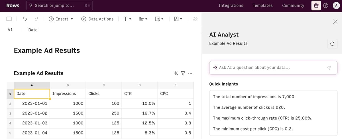 After importing a spreadsheet into Rows or pulling the data directly from linked accounts, you can click the AI icon in the upper right corner. Rows automatically generates takeaways from your data. For example, it reveals average datapoints as well as best and worst metrics.