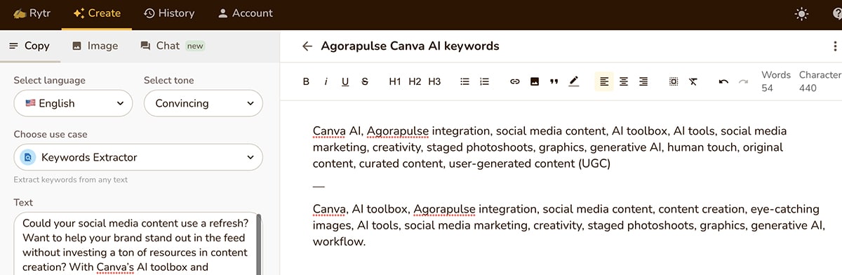 Rytr’s keyword extractor can also identify keywords from any text you input, including competitor content. Using this output, you can build a more informed content strategy and publish better performing content.