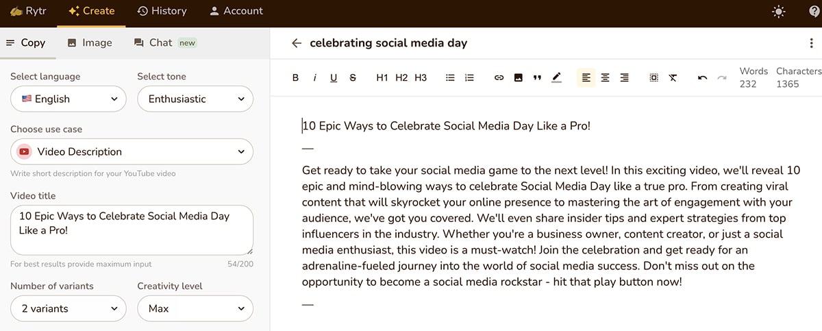 The YouTube video idea generator is great for coming up with topics quickly. And if you decide to create one of the videos, you can use Rytr to generate a description quickly.