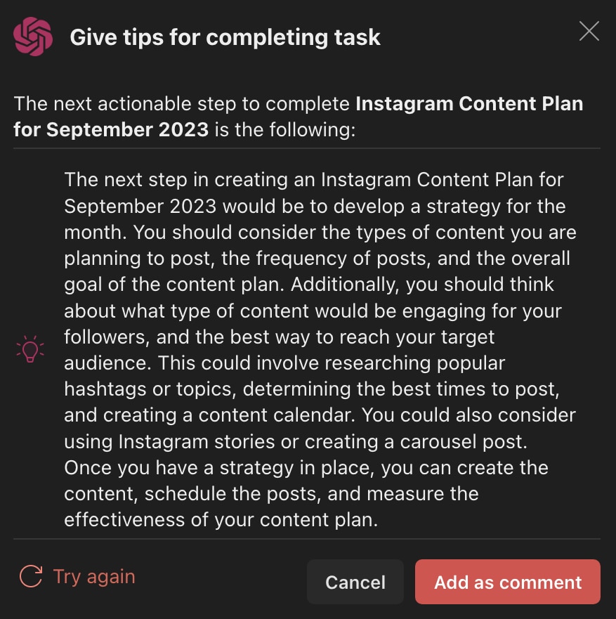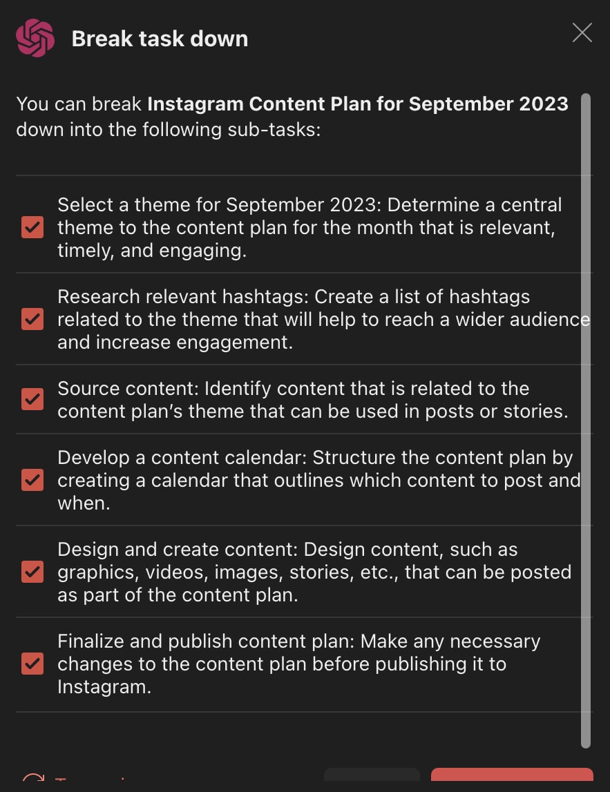 You can also prompt the AI generator to break the task down. This option is particularly helpful if you tend to add a lot of general tasks (i.e., “content plan for next month”) to your calendar.
