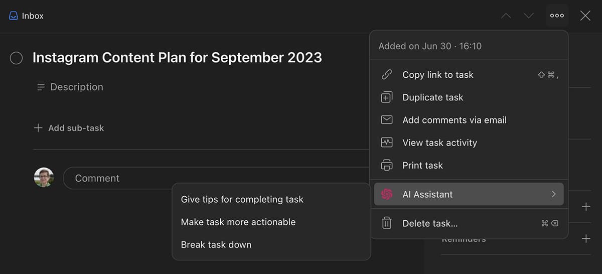 Todoist’s new AI tools are great for reframing tasks or helping you complete complex projects. For example, once you add a task to your timeline, you can use the AI integration to get tips for getting started.