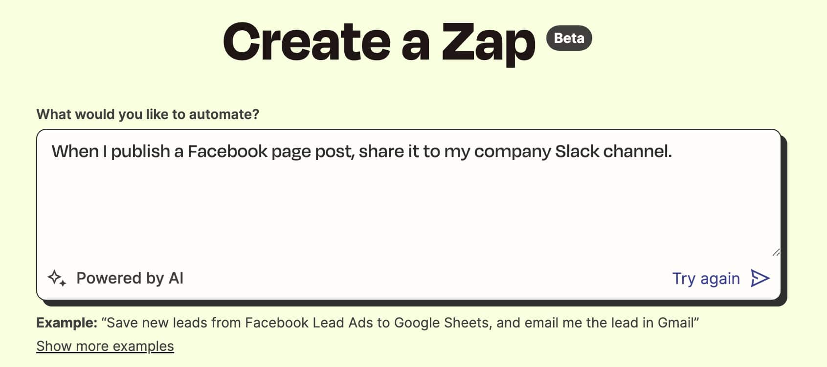 In a couple seconds, it generates a Zap automatically. From there, you can click Try It to connect relevant accounts, make any necessary manual edits, and enable the workflow.