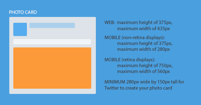 These recommended dimensions (280 px by 150 px) are the minimum requirement Twitter has imposed for photo cards. The photo card puts your image at the center of the tweet. Clicking on it will lead to a larger and more detailed view, just like the popup photo view on Facebook.
