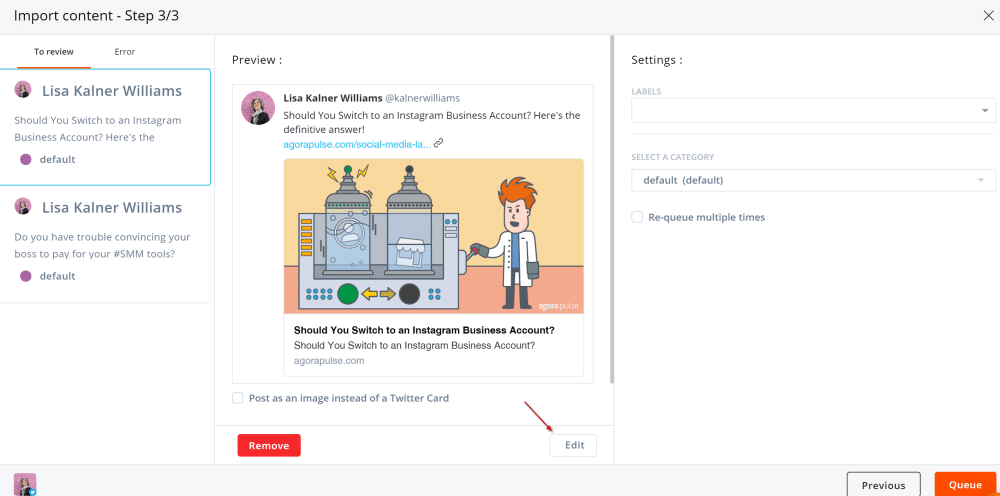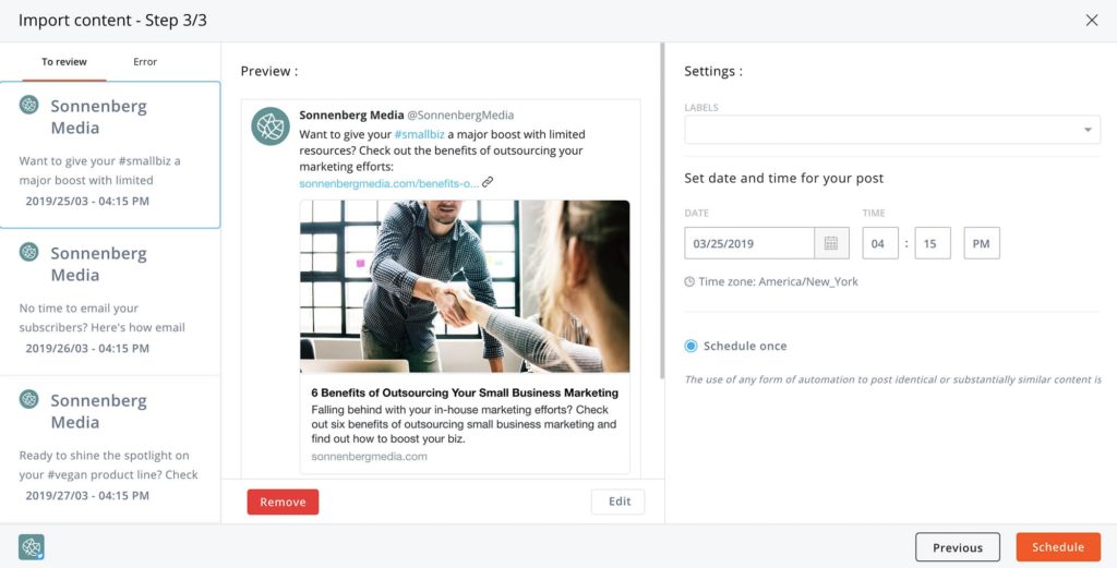 Even when bulk publishing, you’ll have a chance to review and modify each post before adding it to your schedule or queue. That means you’ll always know what to expect from your bulk uploads.