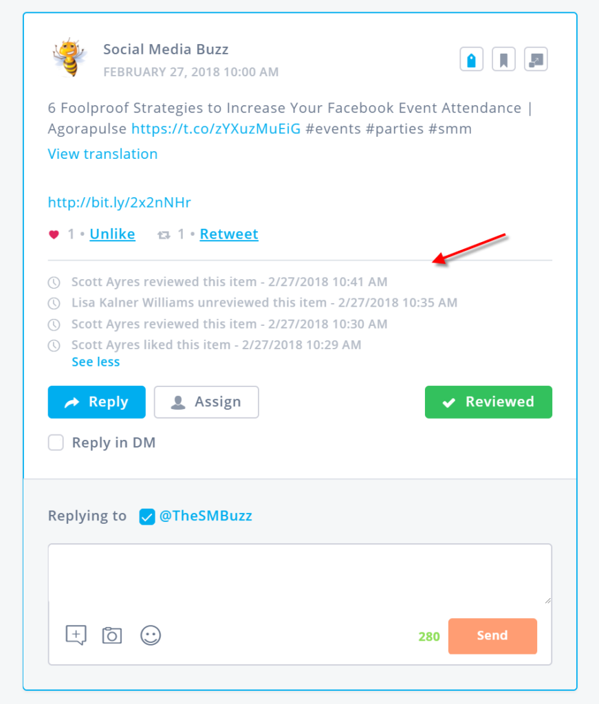 Agorapulse allows you to see who responded to each comment and mention. (Chatbooks would soon find this out.)