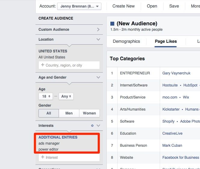 In the example below, we are targeting everyone on Facebook who has an interest in Power Editor and Ads Manager and located in the United States. Apart from the general statistics that Facebook gives, you get an overview of other interests that people like and these can be used in your targeting.