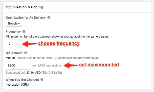 Set a manual bid, and set a specific frequency of the ads. That’s the minimum number of days between showing the ad to the same person.