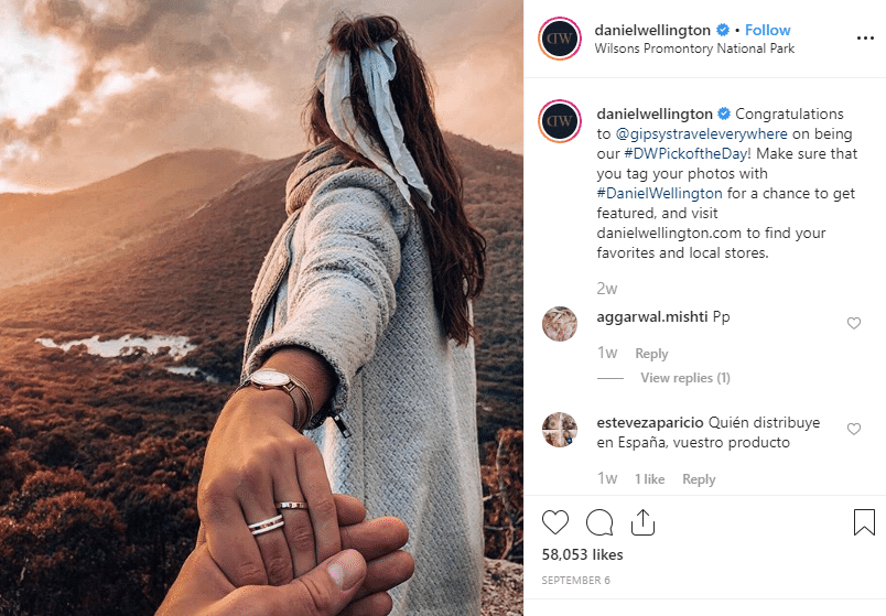Daniel Wellington is firing up followers with its #DWPickOfTheDay contest, which uses UGC. Remember to tag winners in your posts to drum up excitement and extend your outreach.