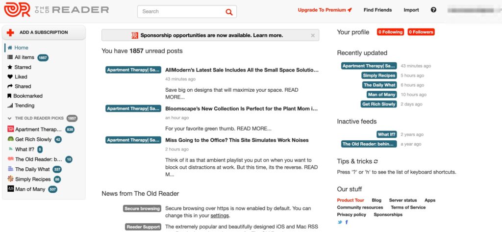 Are you looking for something more streamlined and simple? Then you should check out The Old Reader. Like some of the other tools on this list, it is a basic RSS feeder. It will allow you to upload your Google contacts to see whether any friends use the tool and whether you want to follow their content. Of course, that’s only helpful if a lot of your friends are using this particular RSS tool.
