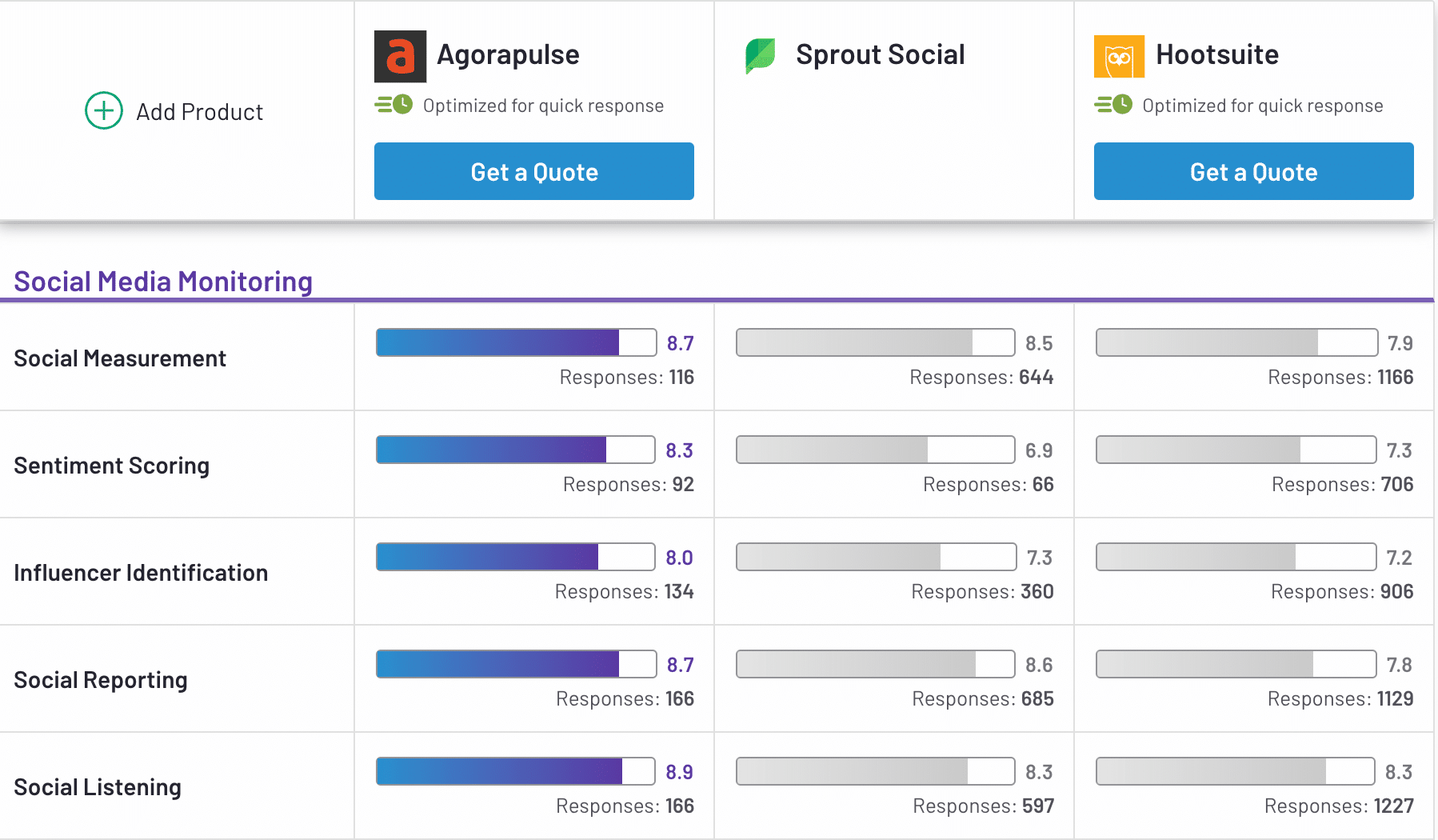 Agorapulse, Hootsuite, and Sprout Social all do a decent job of helping you to create and publish content to all your different social media channels. Although Sprout Social does have a slightly higher score for social publishing than Agorapulse (8.9 and 8.8, respectively).