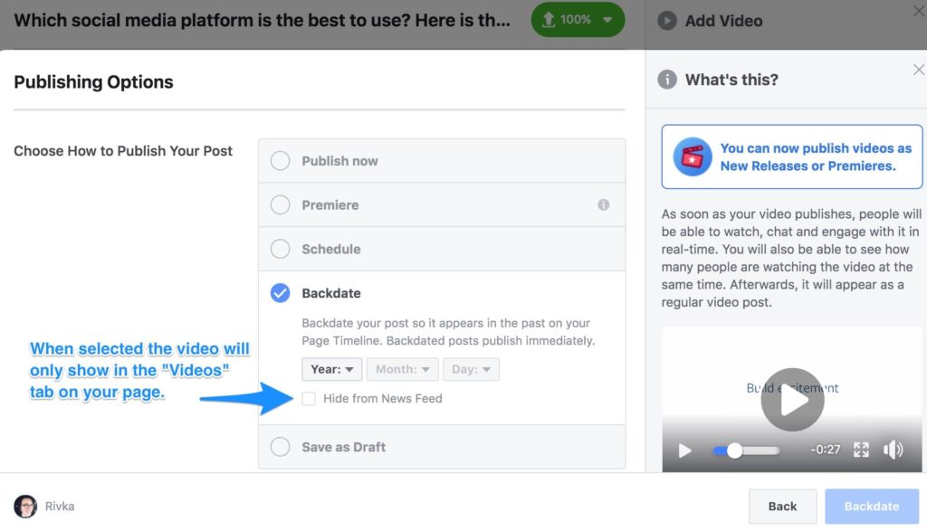 Facebook video publishing backdating