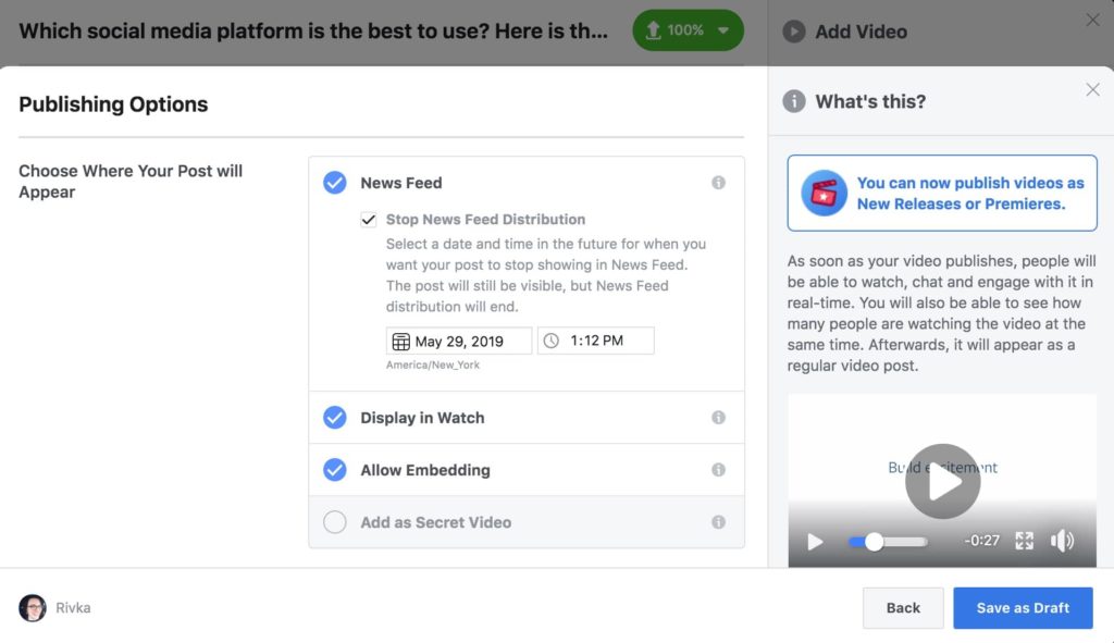 Choose from various Facebook video publishing options.