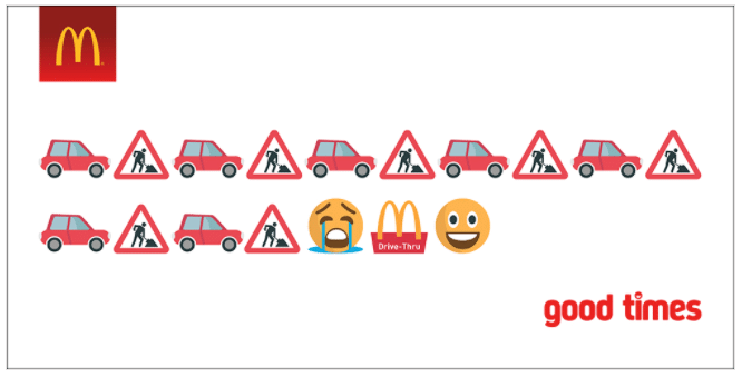 Take this emoji billboard ad from McDonald’s as an example. Regardless of language, we all understand the meaning: Having a bad day? Go to McDonald’s and get happy again. Very smart use of emojis!