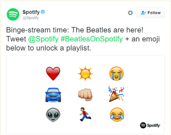 When the Beatles catalog launched on Spotify, Spotify developed fun ways for followers to celebrate the Beatles with social media emojis.