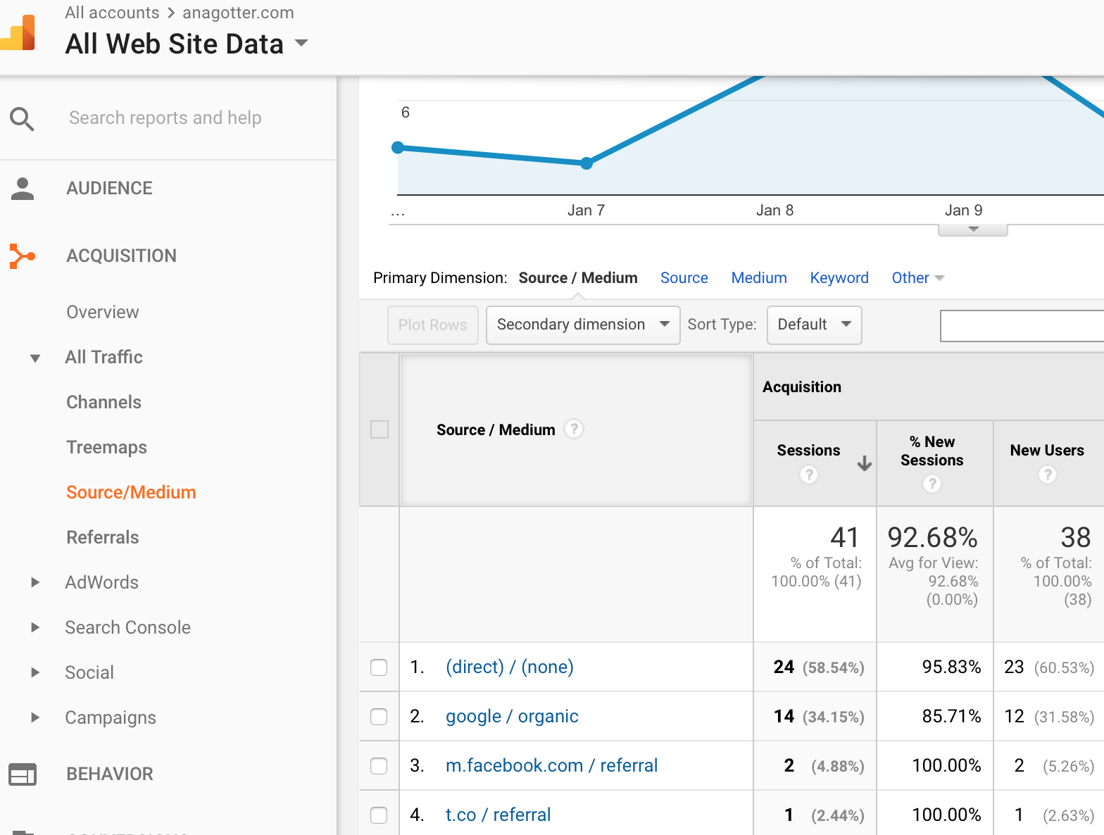 At this stage, I also recommend taking a close look at your Google Analytics. Check out which platforms are sending you the most organic and paid traffic. You can do this by clicking on “Acquisition,” then “All Traffic,” and then “Sources/Medium.”