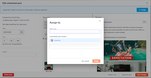 - Don’t forget to add assets. If you’re not using a professional calendar, you will need to make a note of the assets (e.g. video or images) that need to be added. If you’re using Agorapulse, you can utilize the inbuilt asset library to attach images as you schedule. Easy!