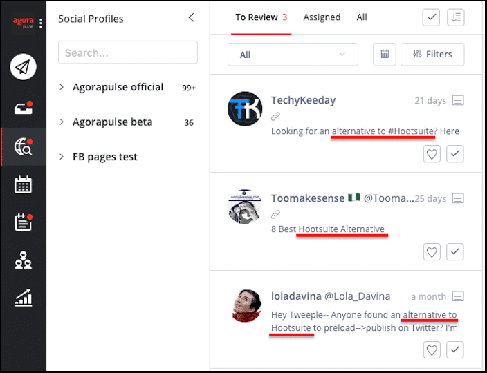 Agorapulse’s social media listening tool will help you keep an eye on your competitors and understand their strategy even better. You can also set filters to notify certain team members of those competitors’ mentions to create a more effective workflow.