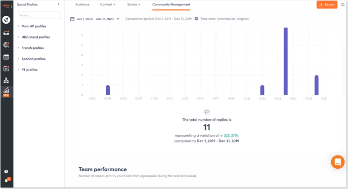 Monitoring your team’s progress will help you identify gaps and issues that need solving. Agorapulse offers detailed and customizable social media reporting features allowing you to track your team’s progress based on your goals.