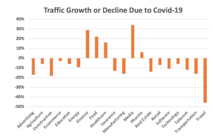 Remember, too, that search has changed during COVID-19, so reassess your Adwords campaigns if you’re running them. The chart below shows how traffic has grown or declined throughout the pandemic. This will give you an indication of whether your ads will hit the spot.