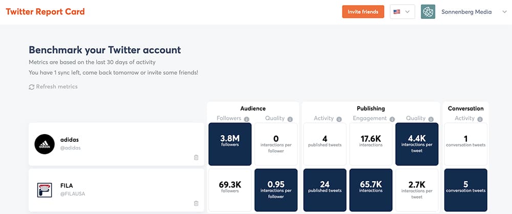 Monitoring your competitors manually can be time-consuming, but tools can help you track their performance automatically. You can log in to Twitter Report Card to see how your brand compares to any competitor you choose.