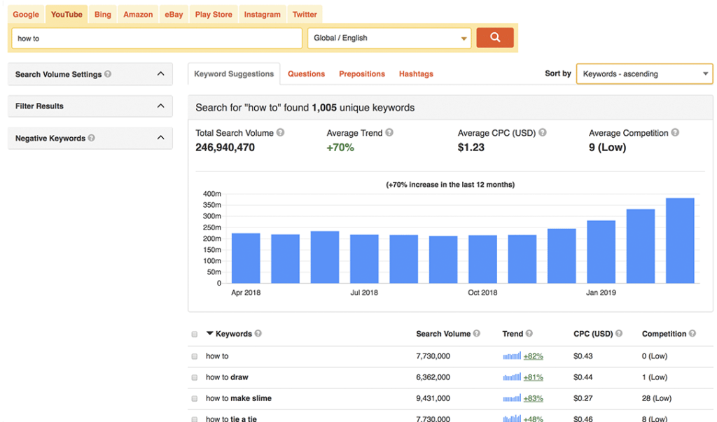 You can use standard keyword research tools, of course. However, you’ll find it most helpful to use keyword research tools that tell you about competition and search volume levels specifically for YouTube.