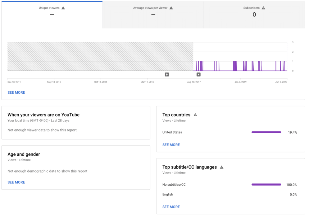 Here, you can learn how many views you’re getting per viewer on average, your total number of subscribers, and key demographic information about your audience.