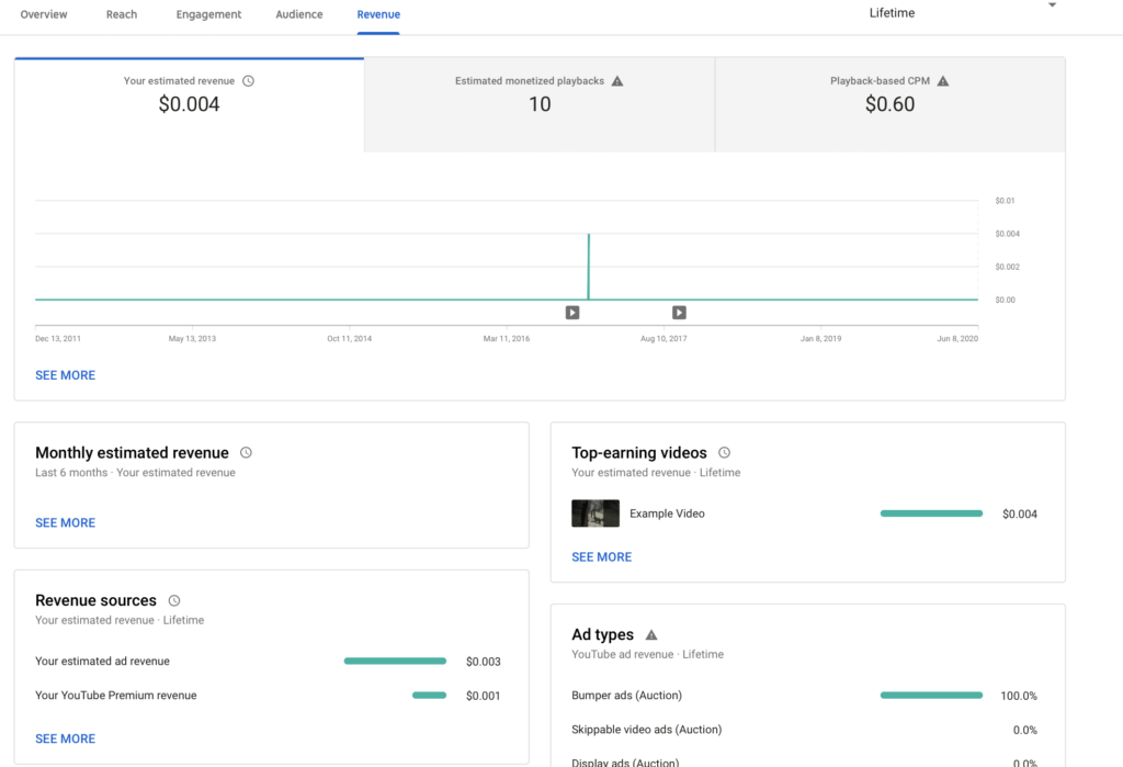 Under this tab, you can view for your top-earning videos, the ad types being displayed, your revenue sources, your monthly estimated revenue, and your current estimated revenue.