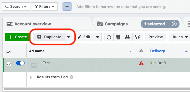 Para hacerlo, llega al nivel anuncio de tu campaña, selecciona el anuncio y haz click en el botón “Duplicar”. Mantén la campaña seleccionada y haz click en duplicar.