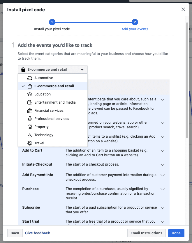 Cuando eliges tu categoría de negocio, Facebook enlistará los eventos más apropiados para tu tipo de negocio así como la manera de usarlo. Si haces click en cada uno, verás el código del evento estándar que podrás usar.