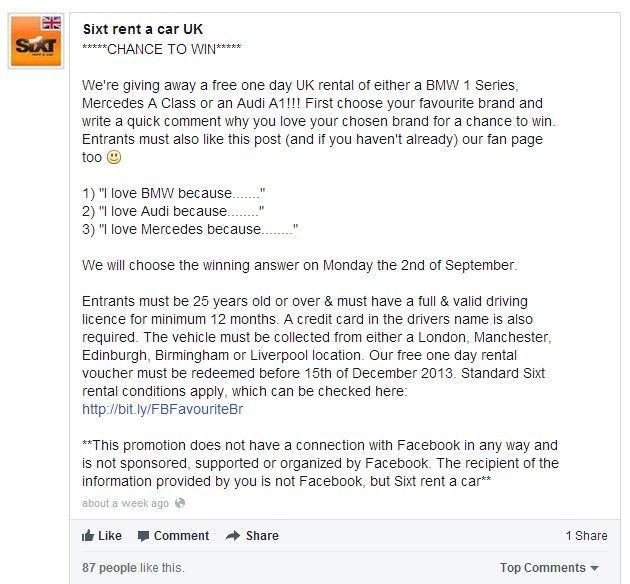Facebook seguirá sin autorizar esta promoción, ya que pide a los usuarios que hagan clic en “Me gusta” Y que la compartan para poder participar. Además, no incluye una referencia a las reglas oficiales.