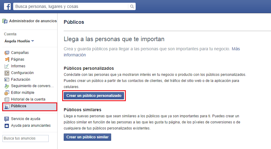 En el Administrador de Anuncios, empieza en la pantalla de inicio y después selecciona Públicos en el menú de la izquierda, que trae consigo una sección a la derecha con dos opciones: Público Personalizado y Públicos Similares. Haz clic en Crear un Público Personalizado.