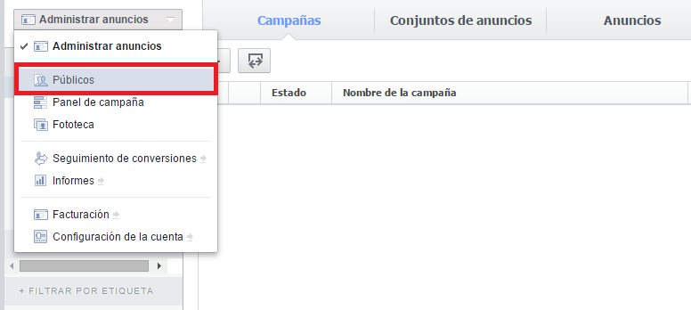 Después, haz clic en el menú Crear Públicos (justo abajo de Públicos).