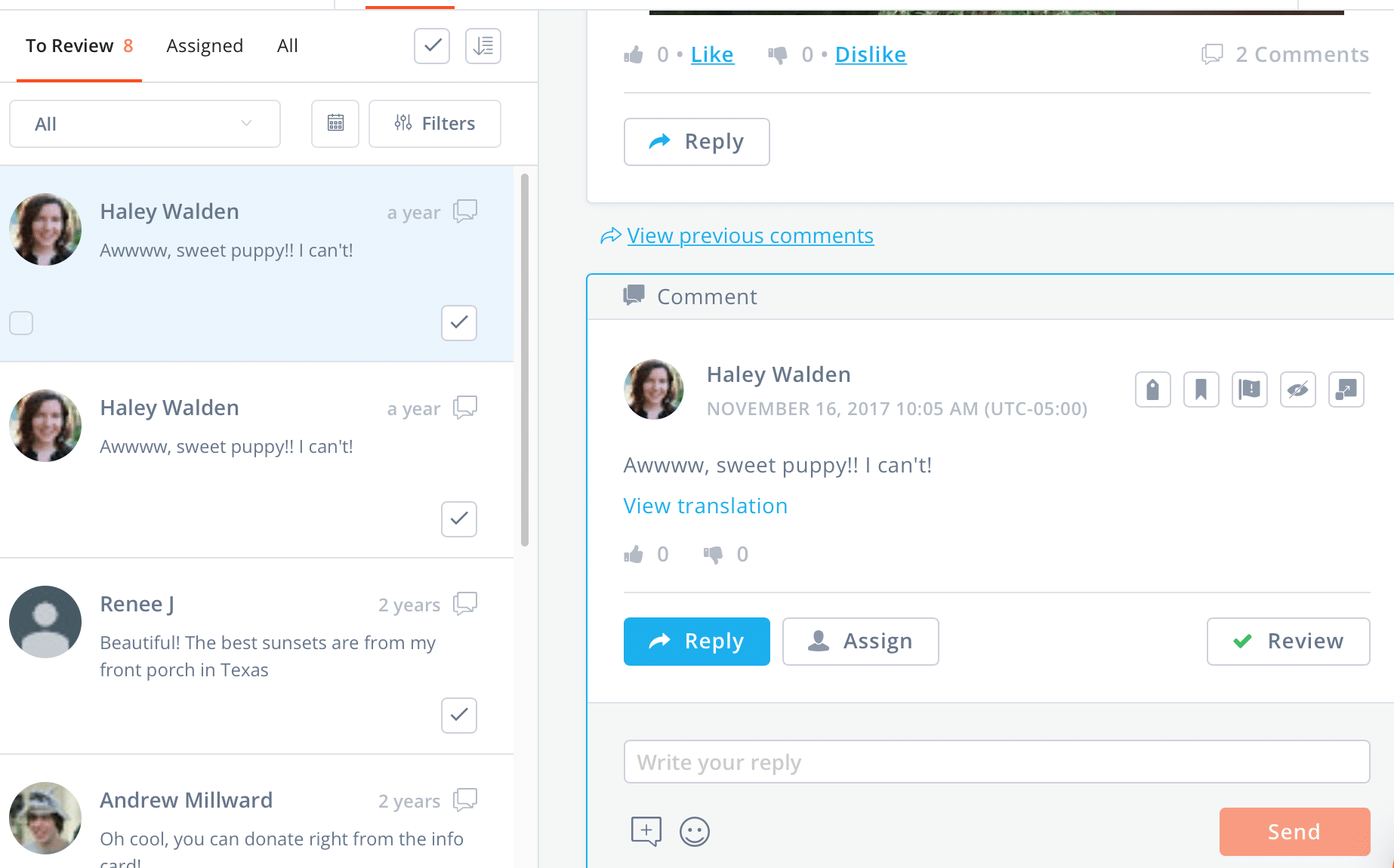 Las funciones de Agorapulse te facilitan esta tarea. Nunca perderás un comentario otra vez. además, podrás responder rápidamente desde un mismo lugar sin tener que iniciar sesión en múltiples plataformas a la vez.