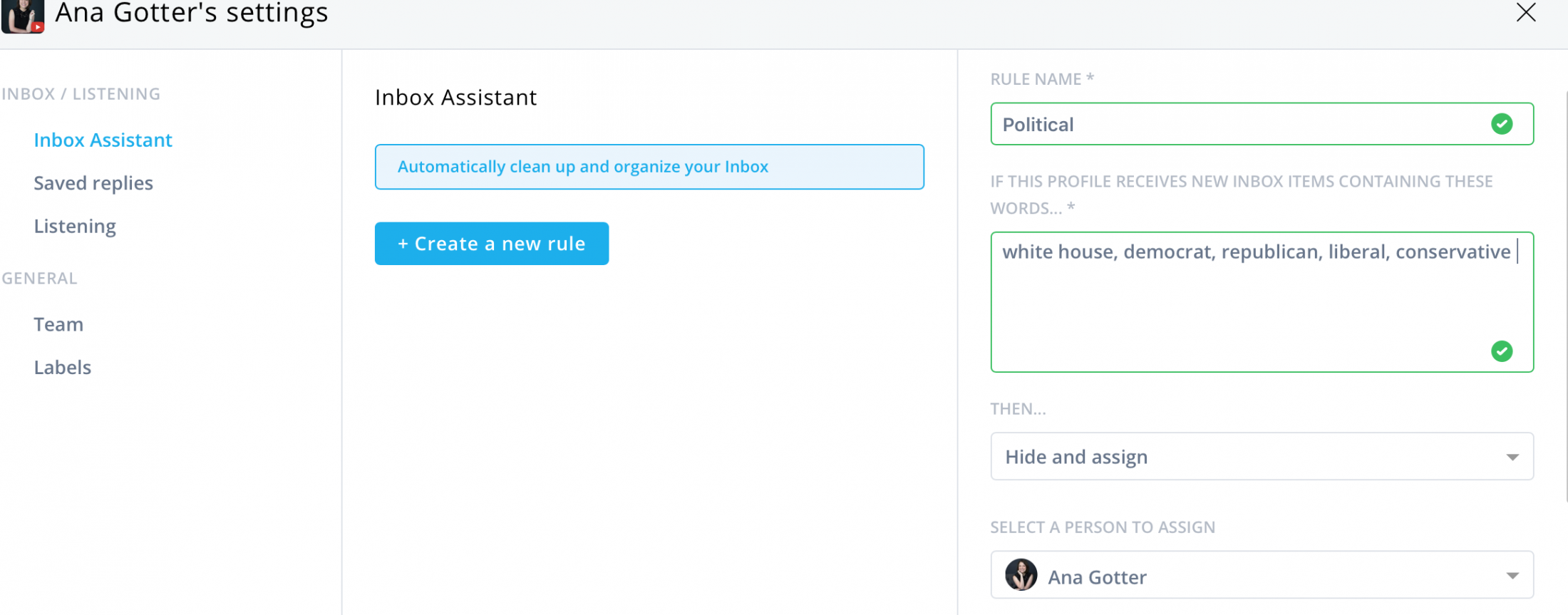 Agorapulse te permite crear reglas de moderación automática que te permitan ocultar ciertos comentarios automáticamente para que puedas ganar un poco de tiempo y responder a cada uno de ellos con la atención que requieren.